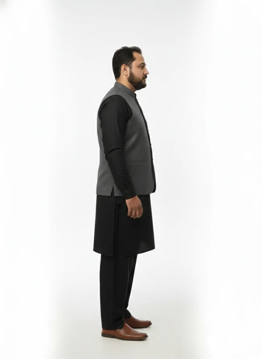 Description: Aik behtreen aur professional look ke liye ye Grey Pinstripe waistcoat lazmi intekhab hai. Is par bani bareek vertical lines aap ko aik lamba aur slim silhouette deti hain. Mandarin collar aur premium buttons ke saath ye waistcoat office meetings, shadi ki taqreebat aur formal dinners ke liye perfect hai. Ise black ya charcoal grey suit/kurta ke saath match karein.