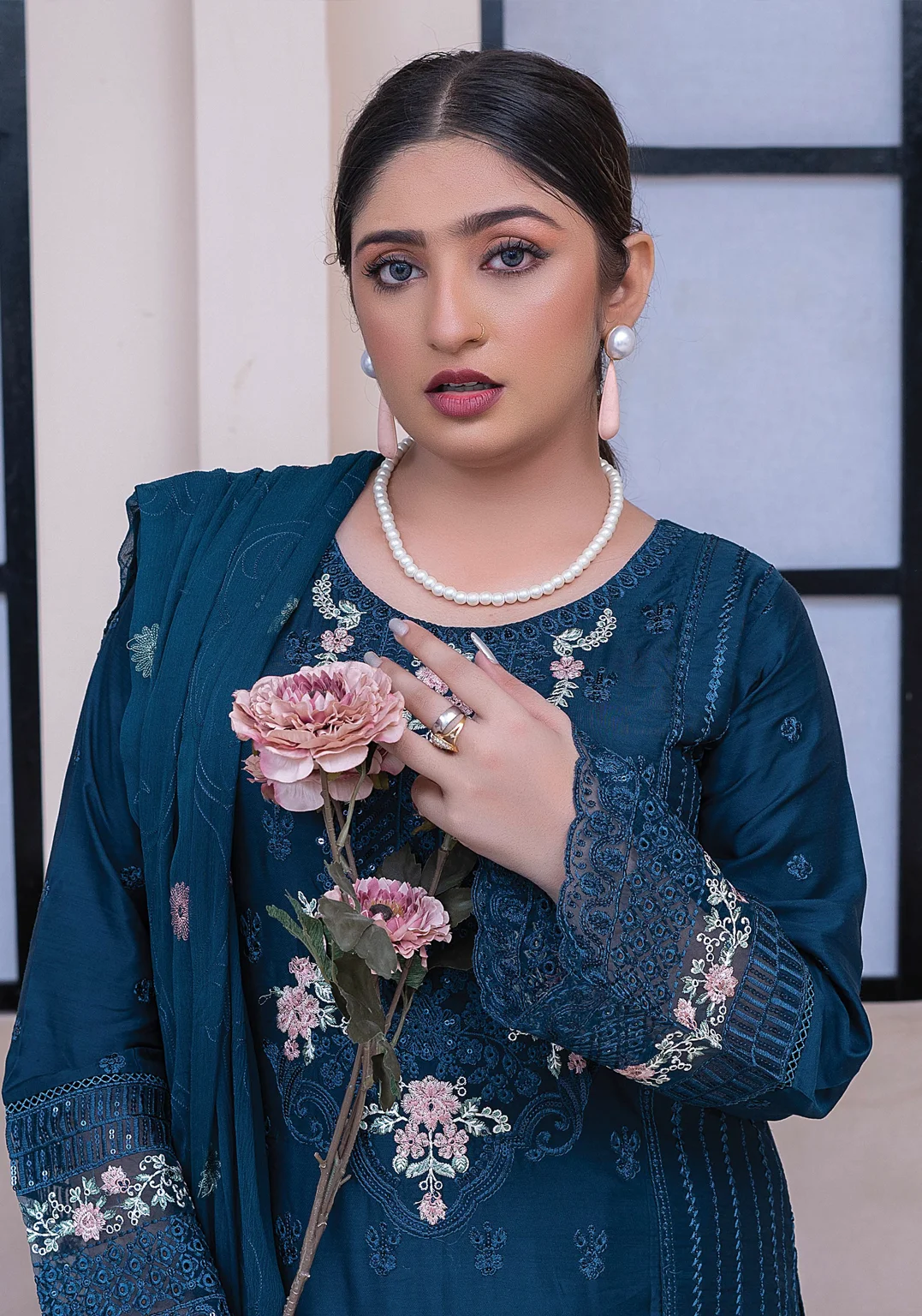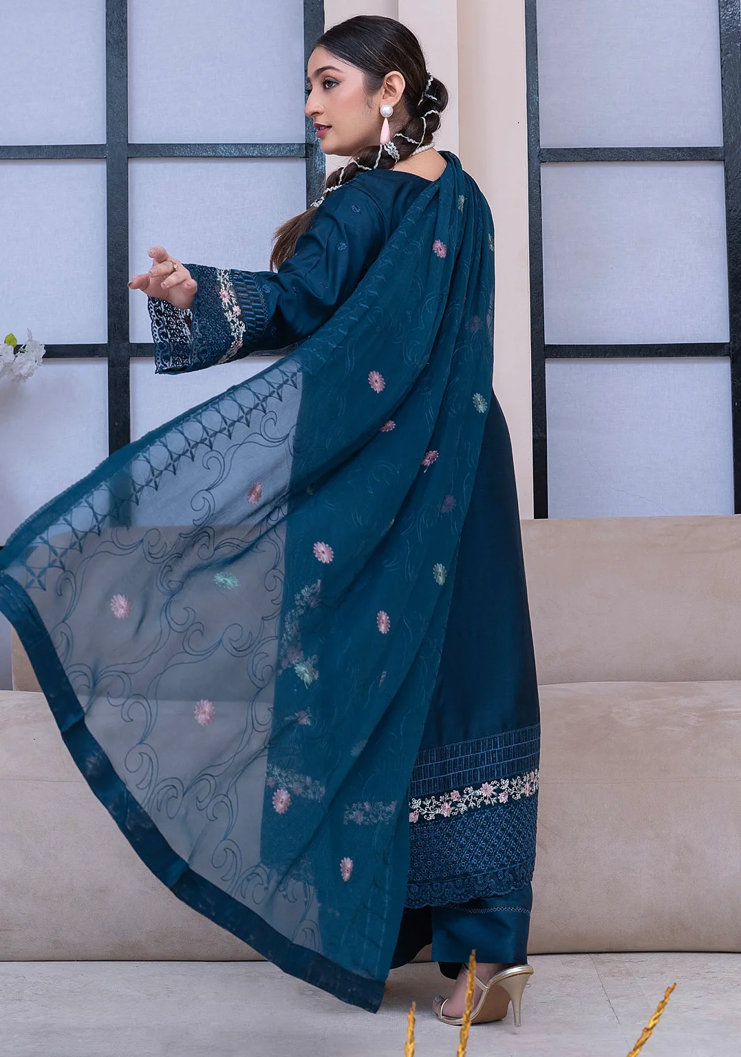 Teal blue embroidered 3-piece suit with chiffon dupatta. Perfect for semi-formal events, parties & festive gatherings. Premium quality embroidery.