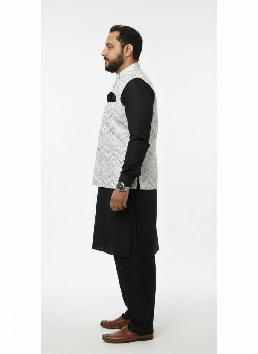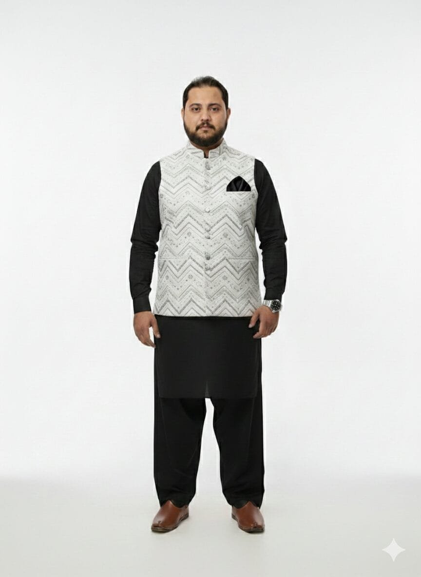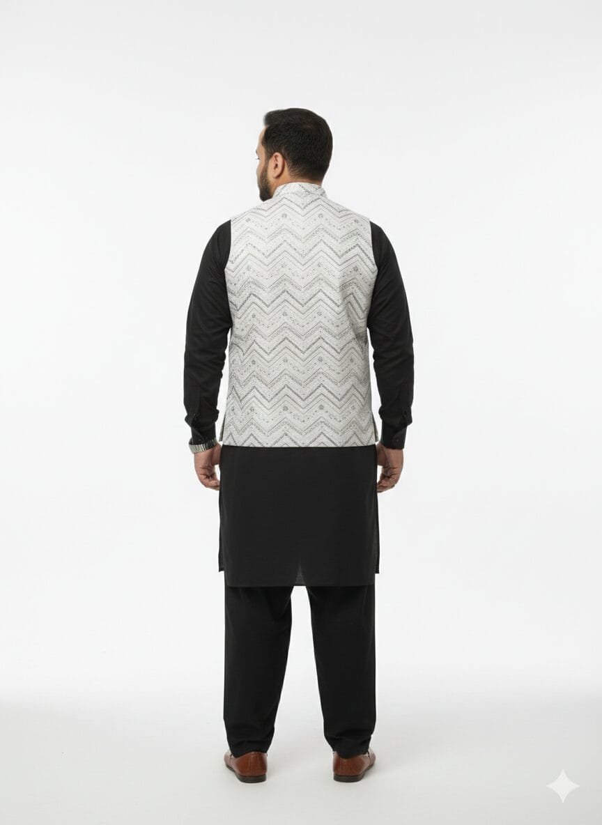 Elevate your traditional look with this stunning white waistcoat featuring intricate zigzag embroidery and subtle silver sequin work. Designed with a classic Nehru collar and decorative buttons, it adds a bold statement to your festive or wedding attire.